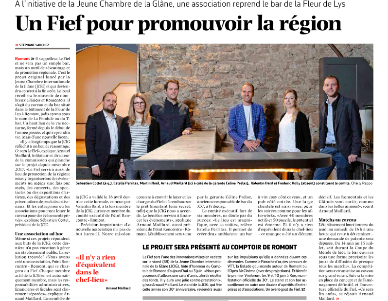 Fort de ce constat et ne souhaitant pas rester les bras croisés, la JCI Glâne a créé, en novembre 2017, la commission « lieu de rencontre ». Cette commission avait pour but d’étudier une éventuelle création d’un lieu de rencontre dans la région glânoise. Après de nombreuses discussions, la commission a décidé d’apporter concrètement sa pierre à l’édifice. C’est ainsi que le 16 avril 2018, sur demande de la commission « lieu de rencontre », la JCI Glâne a convoqué une assemblée générale extraordinaire. Celle-ci a soutenu massivement le projet de création, à Romont, d’un lieu de rencontre dénommé « le Fief », qui est un bar à vin dont le but est de proposer des produits du terroir ainsi que des activités culturelles promouvant les personnalités culturelles régionales et la région glânoise.