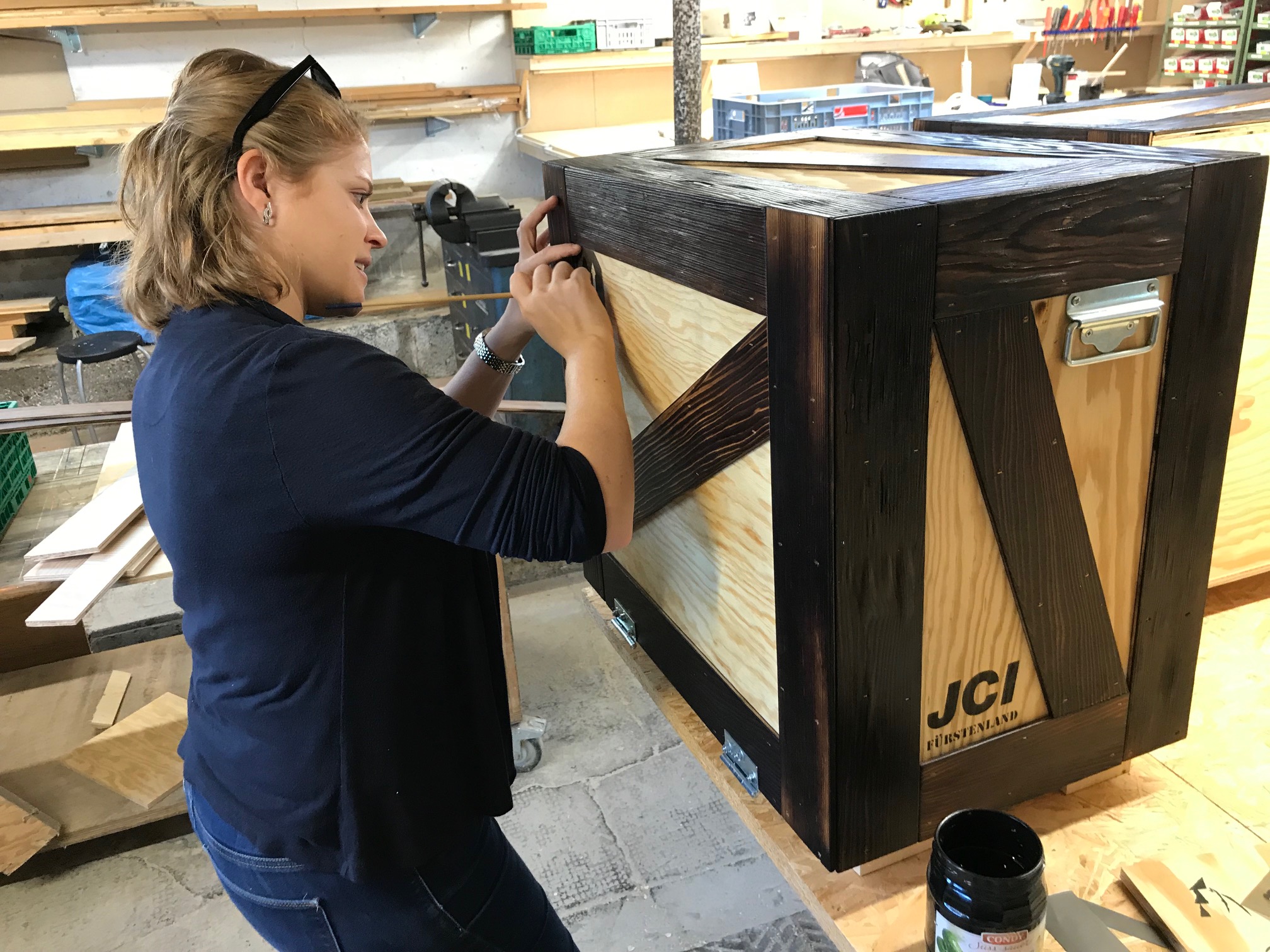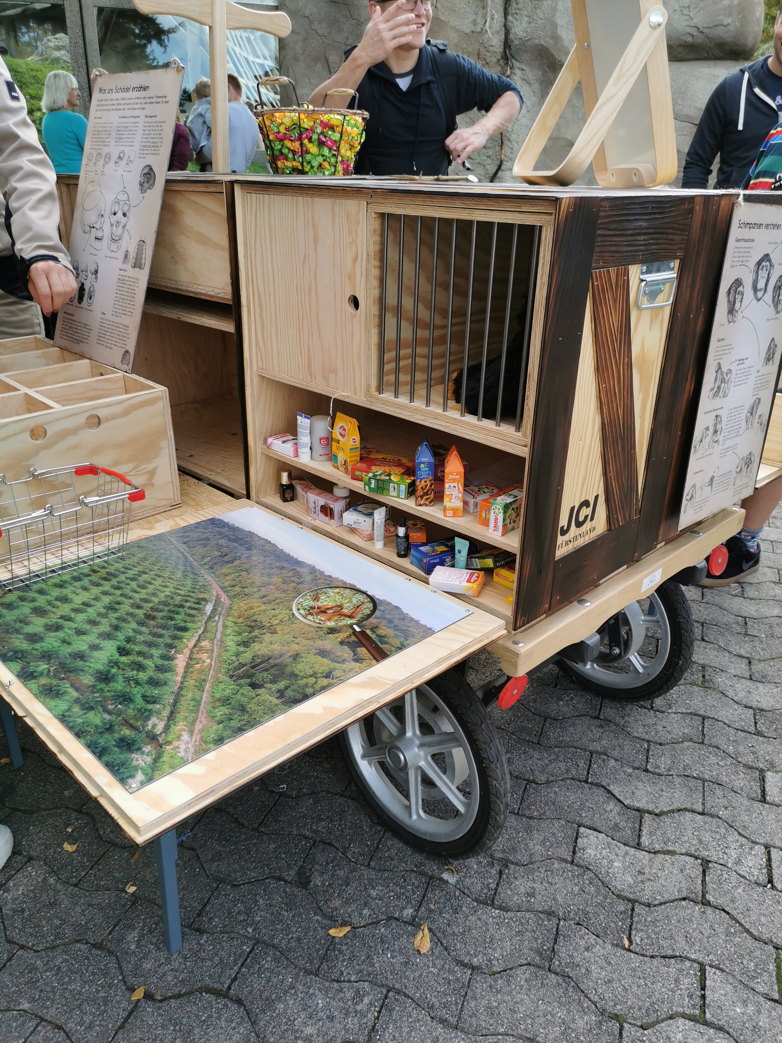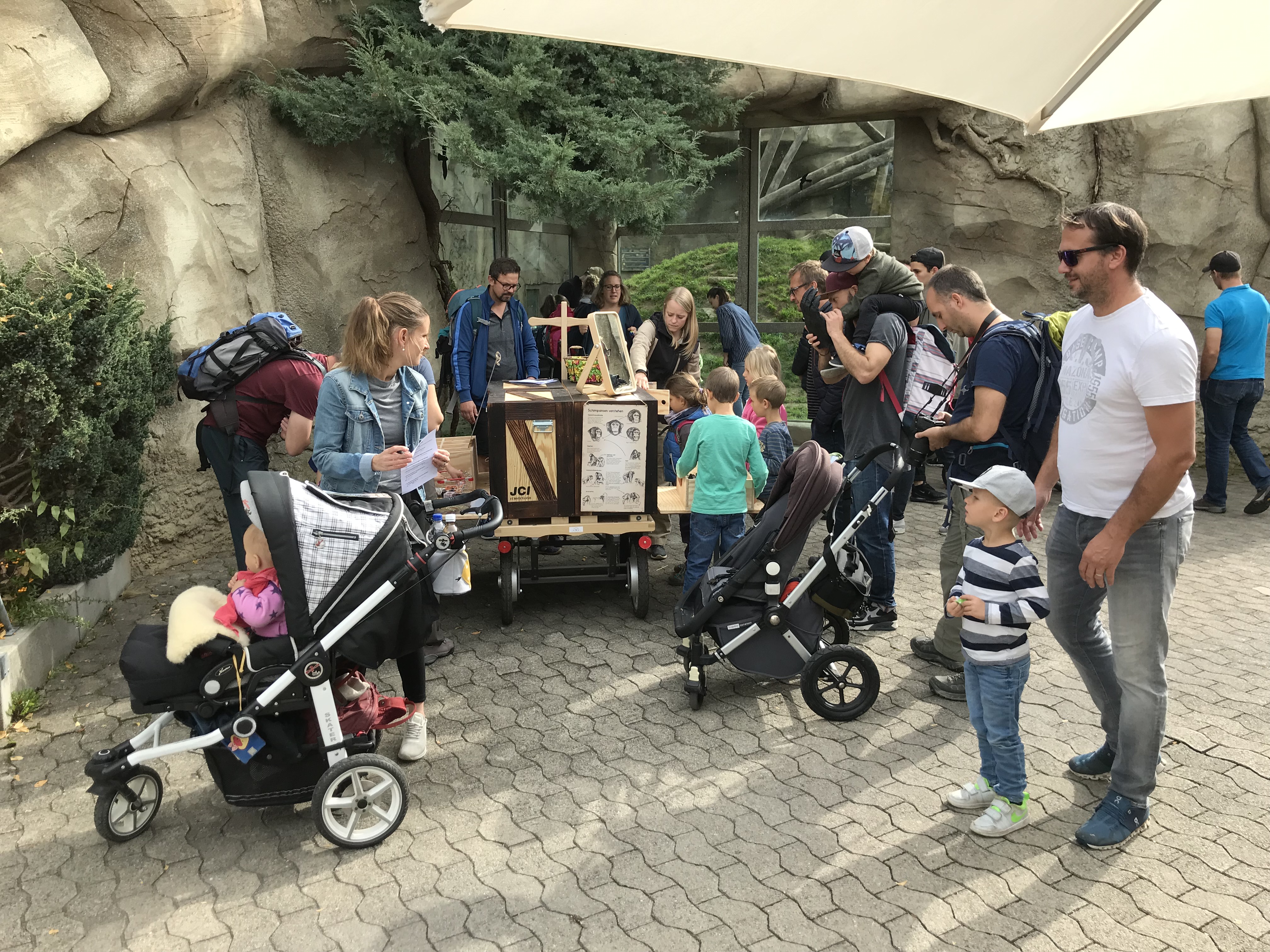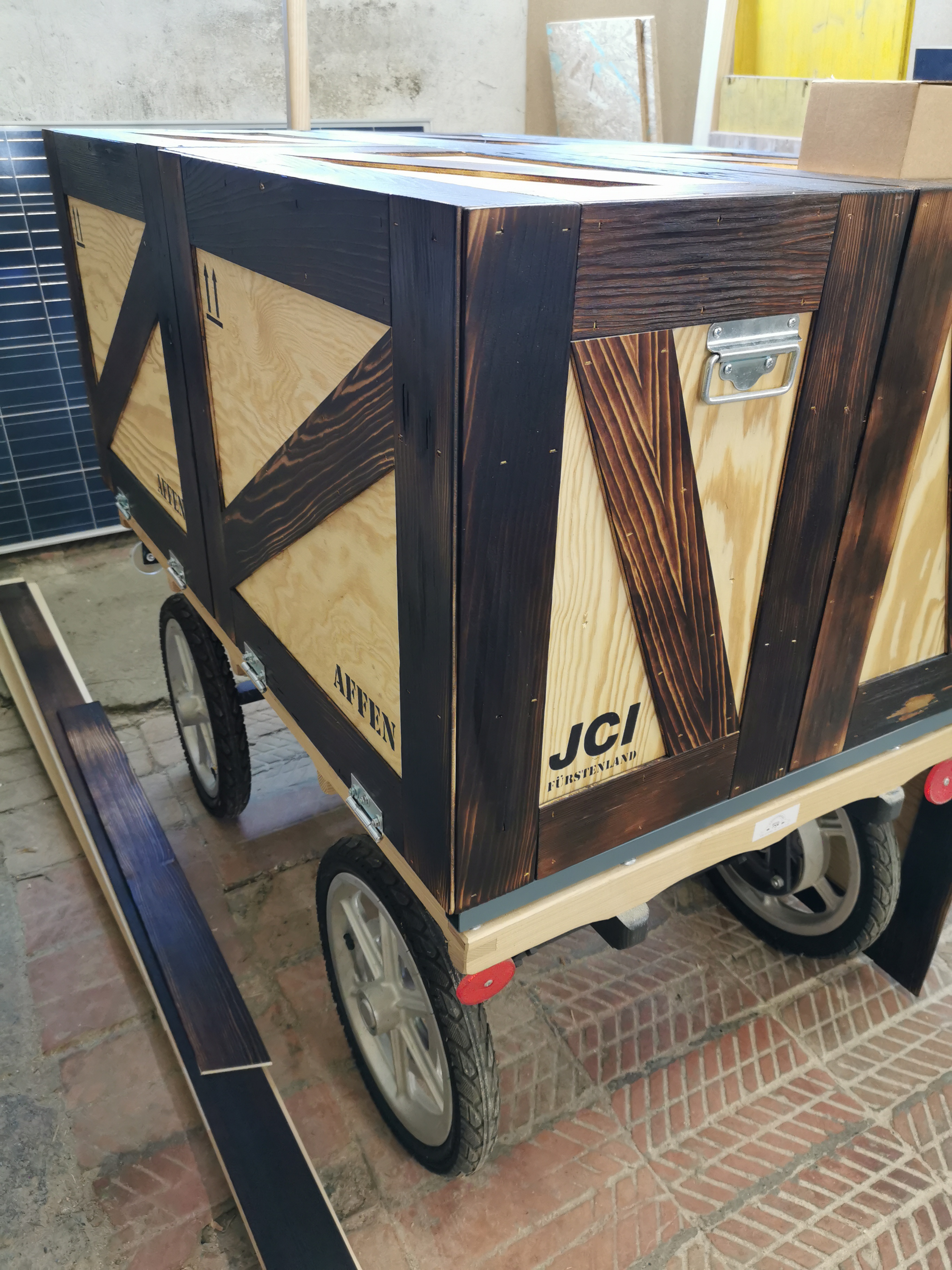 In insgesamt 2x 120 Arbeitsstunden, verteilt auf sechs Abende, hat das Team der JCI Fürstenland die acht Kisten auf dem Holzwagen zusammengezimmert. Die fertige Expeditionskiste ist mit den verschiedensten Inhalten zum Thema Affen bzw. Reptilien gefüllt. So können beispielsweise Schädelmodelle verschiedener Affenarten nicht nur angeschaut, sondern auch gleich in die Hand genommen werden. Eine Kiste enthält ein Geschicklichkeitsspiel, bei dem sich Kinder einen Sugus erspielen können – wenn sie sich denn so geschickt anstellen wie die Schimpansen. In einer Kiste ist sogar eine lebendige Schlange, die zur Anschauung vom Tierbegleiter heraus genommen werden kann. So macht die «Expeditionskiste» Wissenswertes aus der Affen- und Reptilienwelt erlebbar.