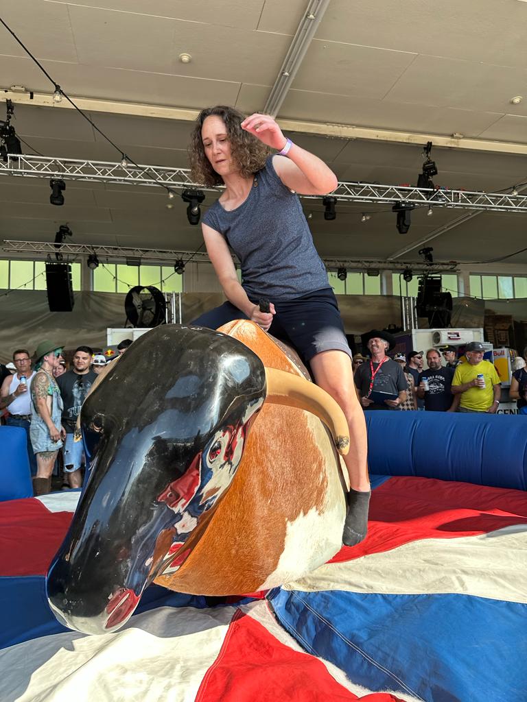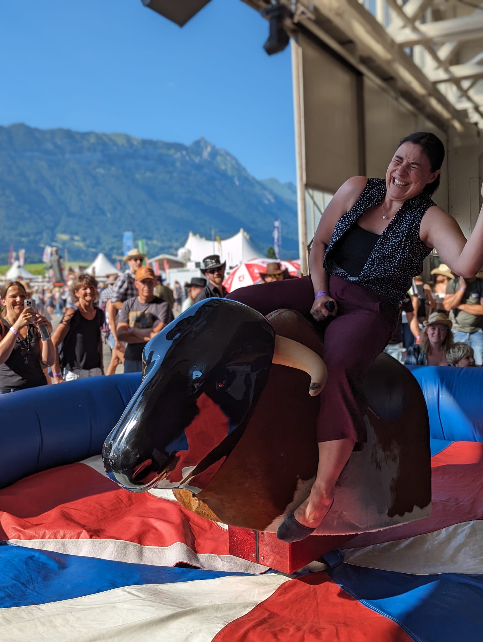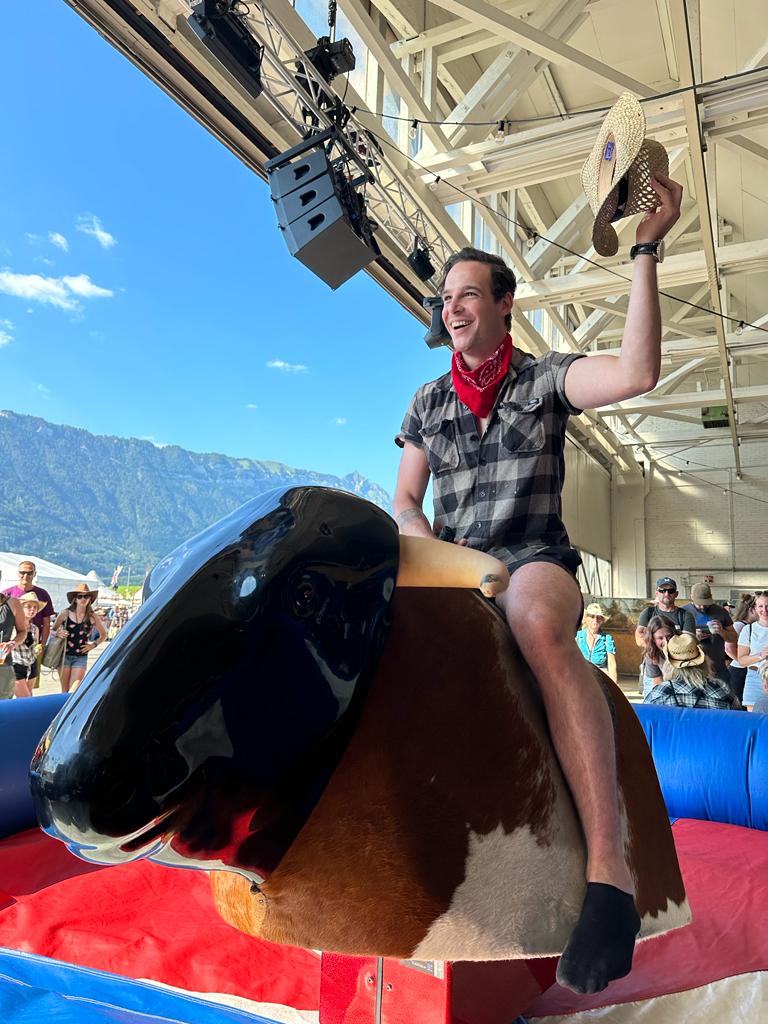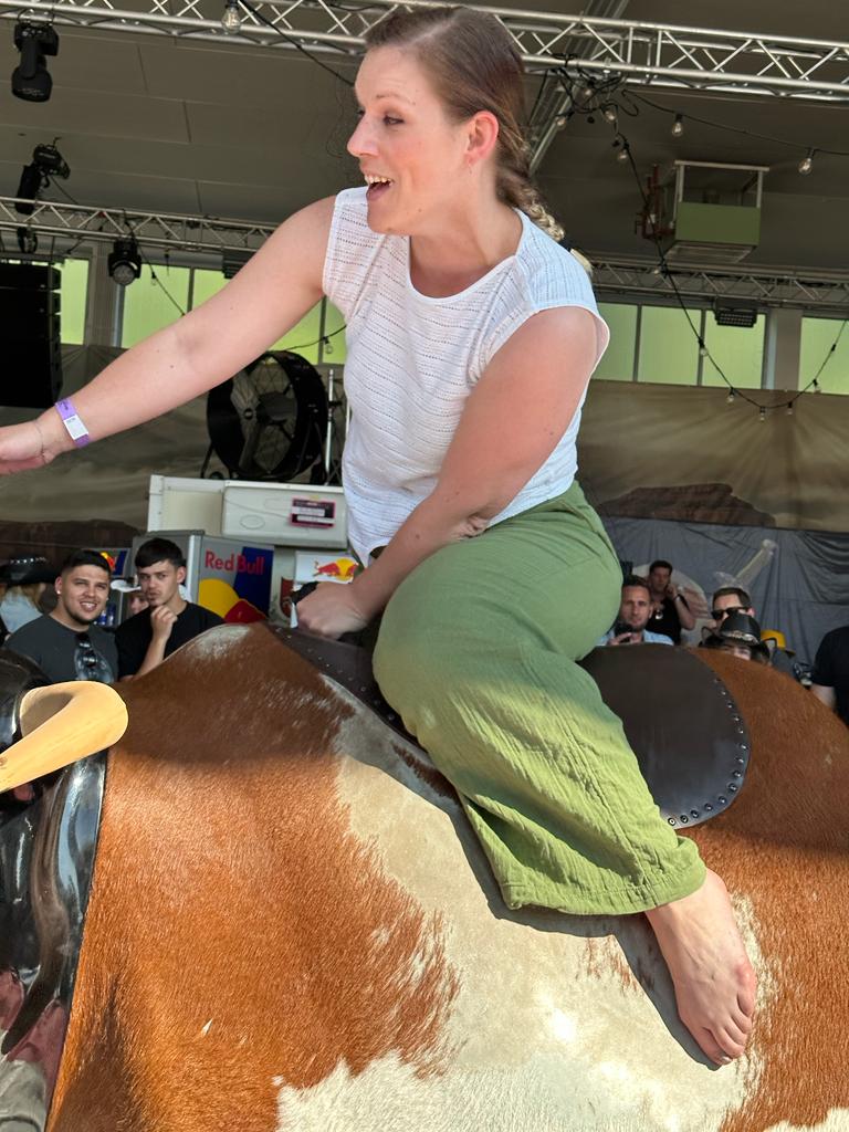 Zudem konnten wir uns im Bullenreiten messen und mussten feststellen, dass auch dies einfacher aussieht, als es tatsächlich ist. Trotzdem konnten wir uns alle für über eine halbe Minute auf dem Bullen halten. Nach dem Bullenreiten haben wir uns den von unserer LOM gesponserten Apéro redlich verdient.