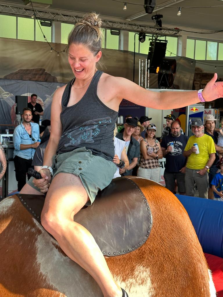 En outre, nous avons pu nous mesurer à la monte de taureaux et avons dû constater que cela aussi paraissait plus simple que ce n'était en réalité le cas. Malgré tout, nous avons tous réussi à rester sur le taureau pendant plus d'une demi-minute. Après avoir monté le taureau, nous avons bien mérité l'apéritif sponsorisé par notre OLM.