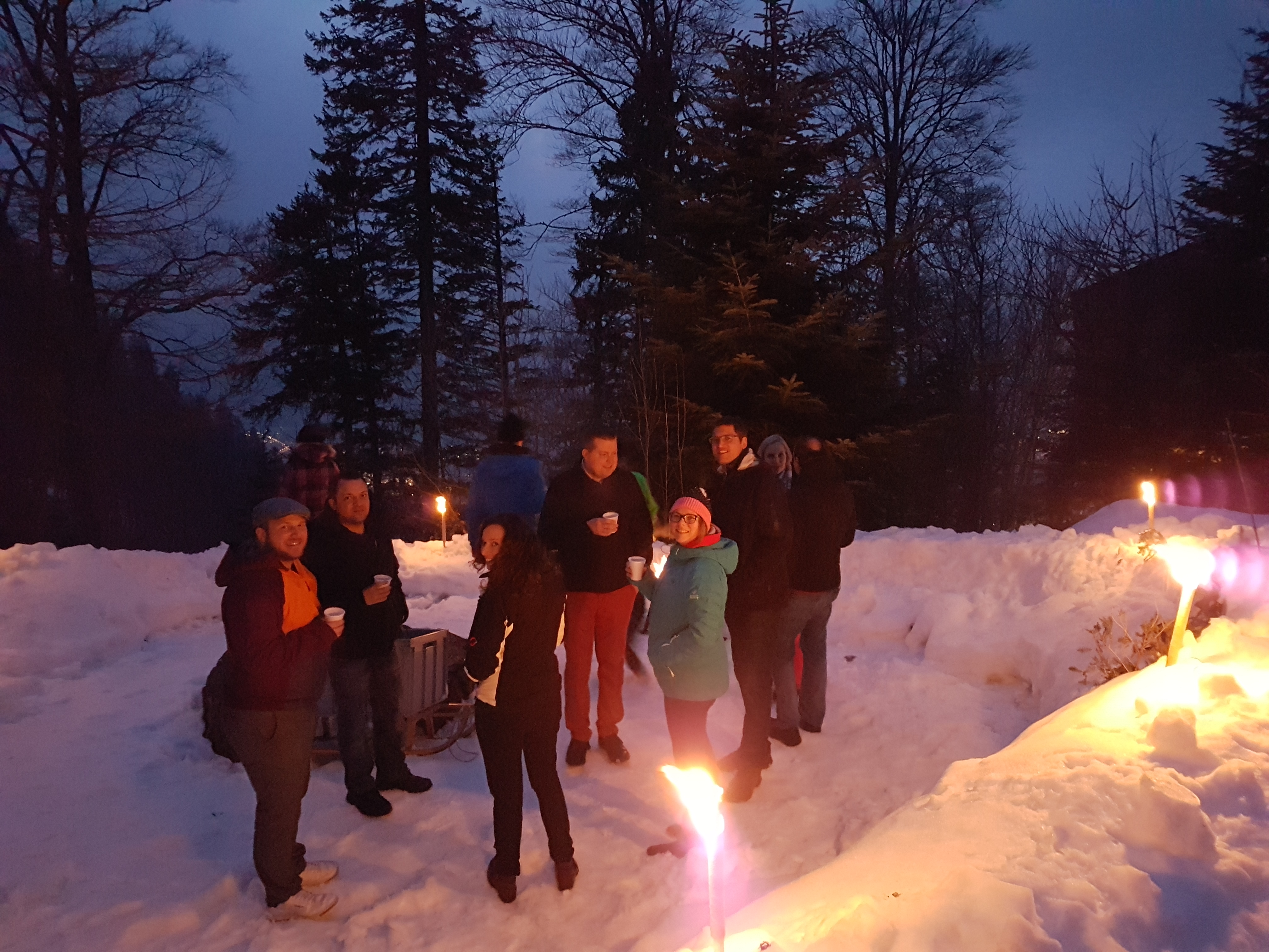 - Glühwein um das Feuer während des letzten Skiwochenendes am 26. Januar 2018 in Stoos