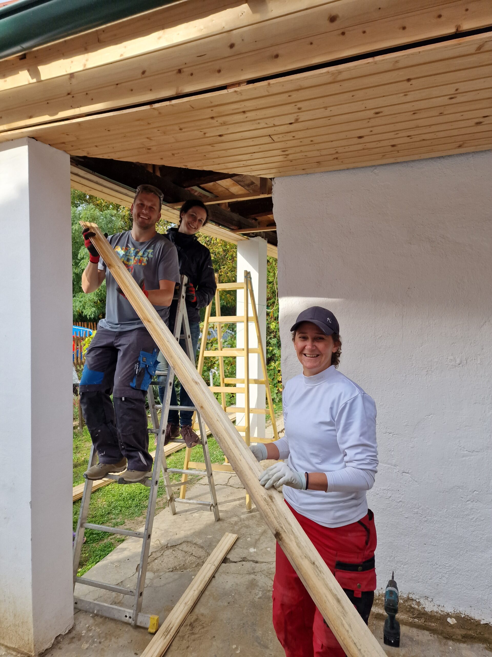 Les travaux supplémentaires du deuxième jour comprenaient : le lambrissage, l'épandage de gravier, la reconstruction de bancs, l'élimination des déchets, le nettoyage et la peinture des poutres en bois. Un coordinateur, Tifó, de InDaHouse Hongrie, a aidé l'équipe de huit JCs pendant les deux jours. Il a fait un travail fantastique en donnant des instructions concises et précises.