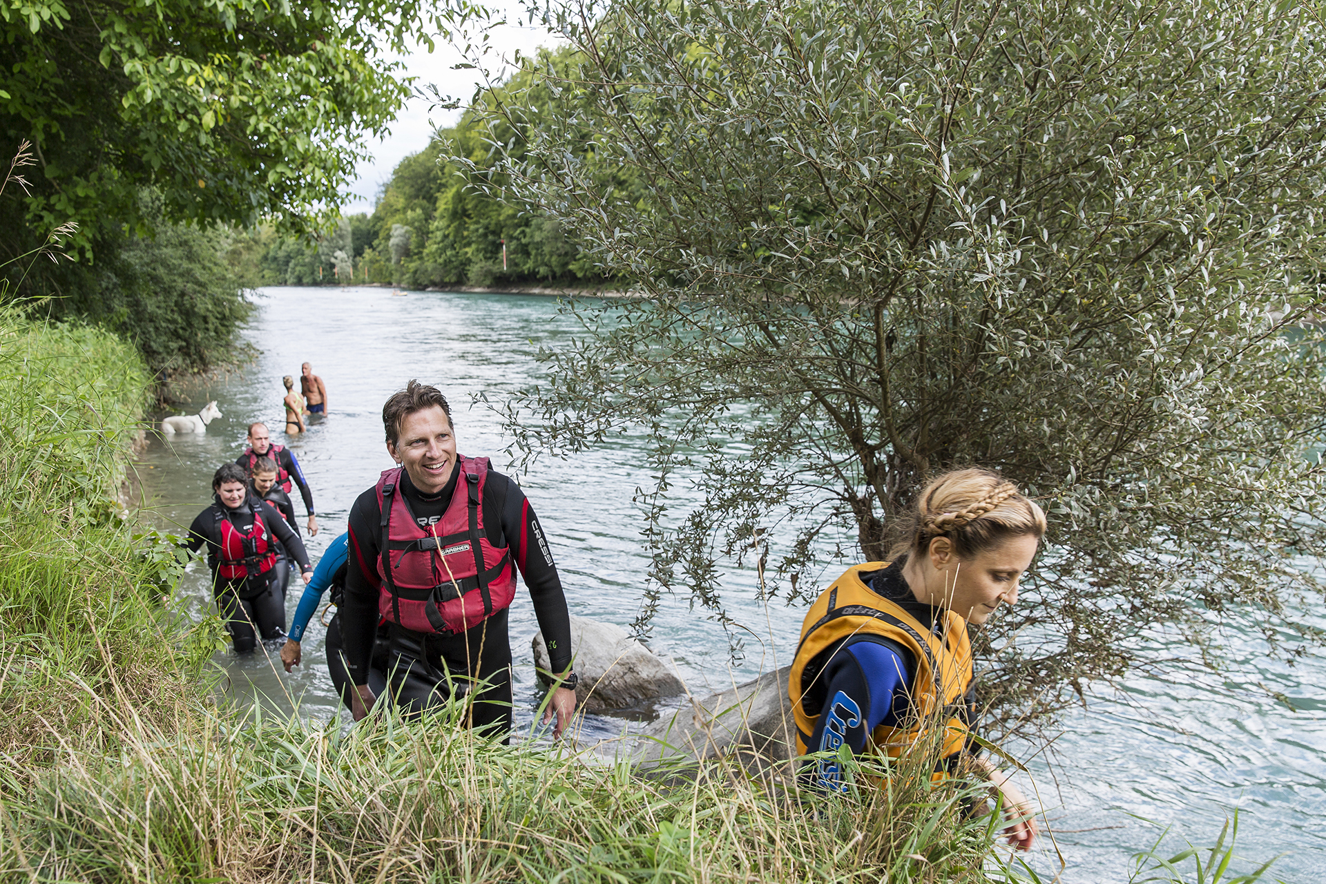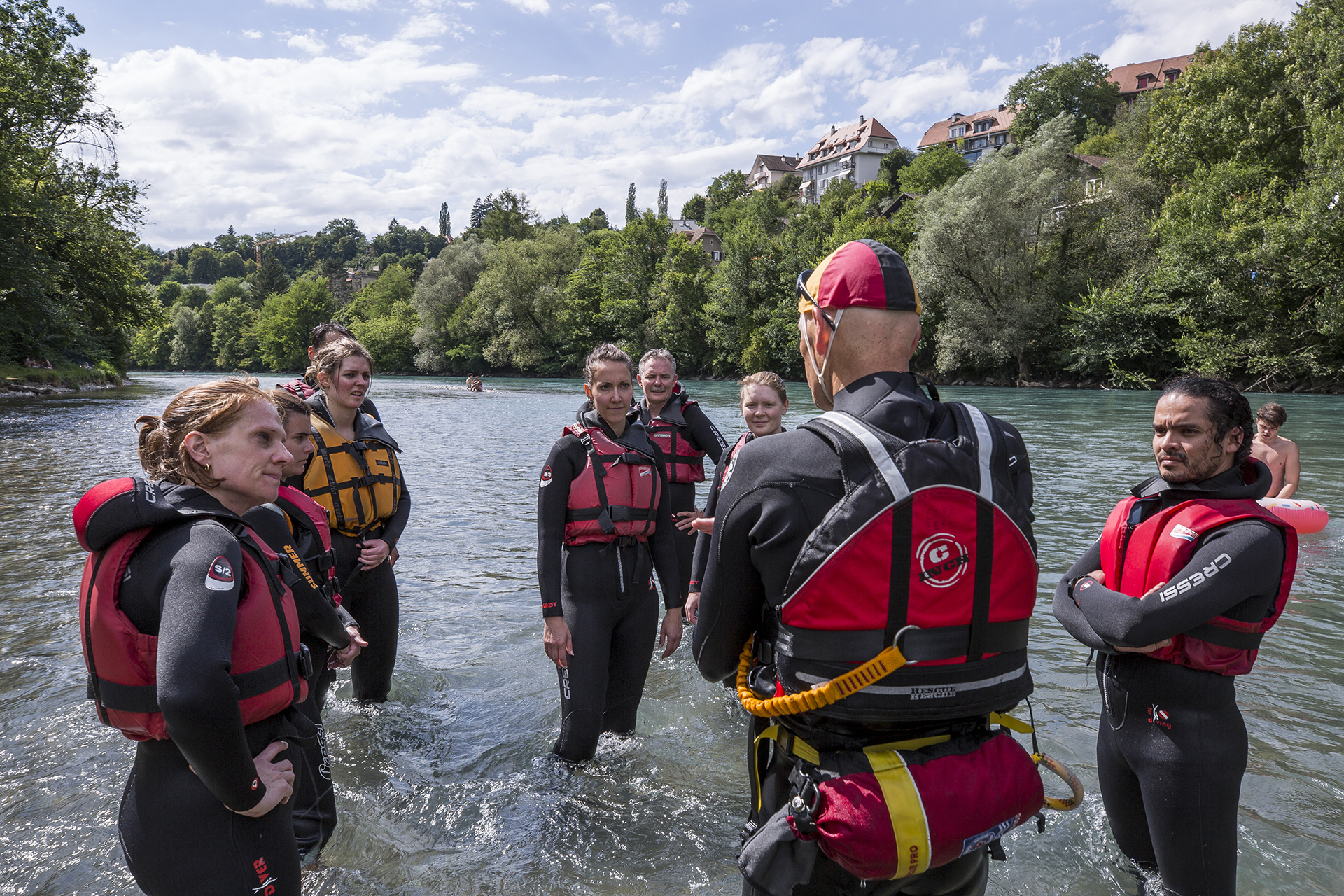 Jede Bernerin und jeder Berner liebt die Aare, und viele steigen im Sommer zur Abkühlung schnell mal in den Fluss. Doch die wenigsten wissen, wie man sich dabei sicher verhält. Das Projekt «Stadtwellen – Sicher y d’Aare», der Aareschwimmkurs, möchte dies ändern und allen Teilnehmenden das sichere Flussschwimmen beibringen. Hierzu konnte die Schweizerische Lebensrettungsgesellschaft SLRG als wichtiger Partner gewonnen werden. Zum ersten Kurs am 5. August 2017 meldeten sich insgesamt 48 Personen an, welche von 6 Rettungsschwimmern in Gruppen von je 8 Personen betreut wurden.