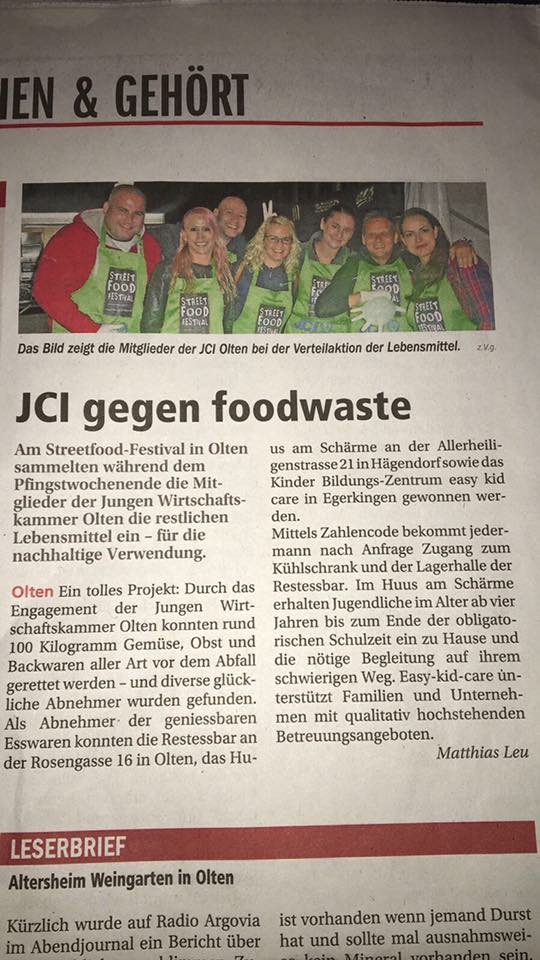 Die renommierten Veranstalter Trend Fabrik und Hannibal-Events organisieren die grösste Streetfood-Festival Tour (SFF-Tour) der Schweiz mit rund 15 Austragungsorten – und JCI Switzerland kann als offizieller Charity-Partner mitwirken. Gemeinsam wurde vor Ort auf die Problematiken betreffend «foodwaste» aufmerksam gemacht sowie die verwertbaren Essensreste eingesammelt und an Bedürftige und sonstige Organisationen verteilt.