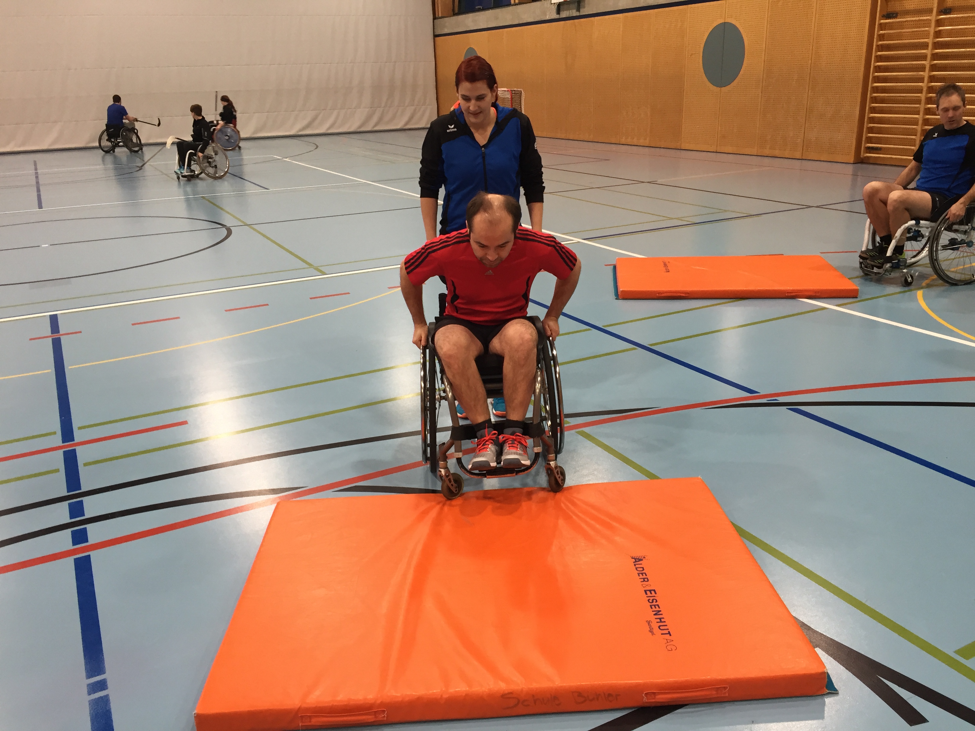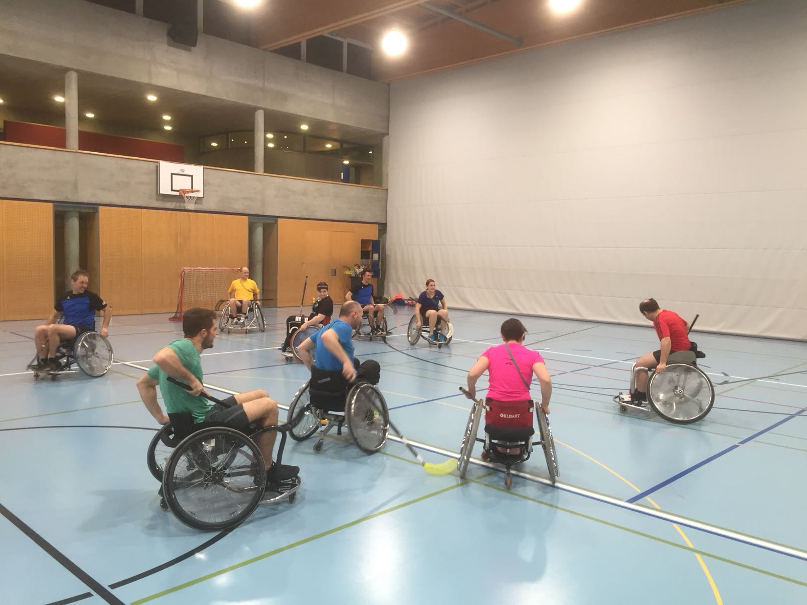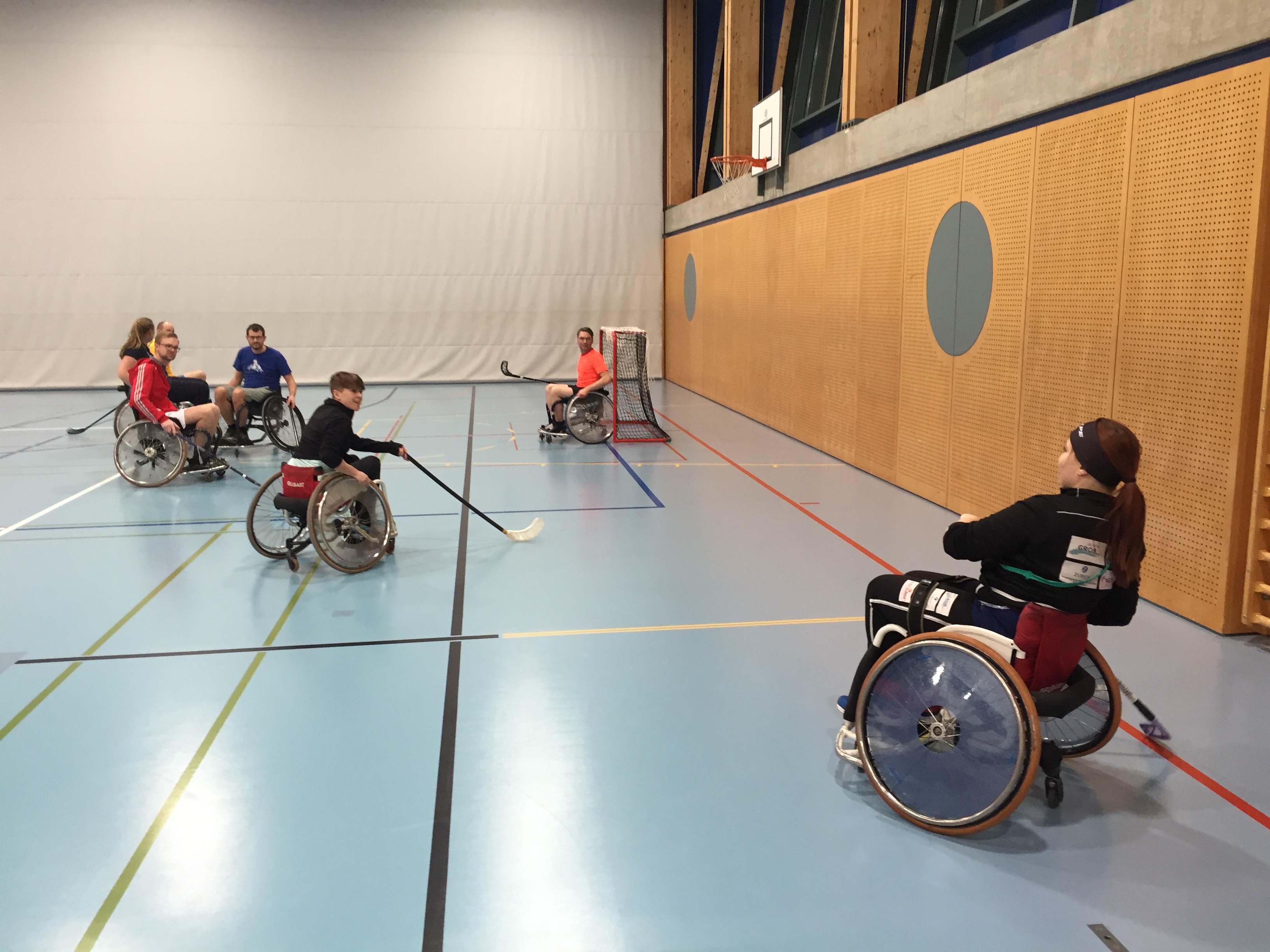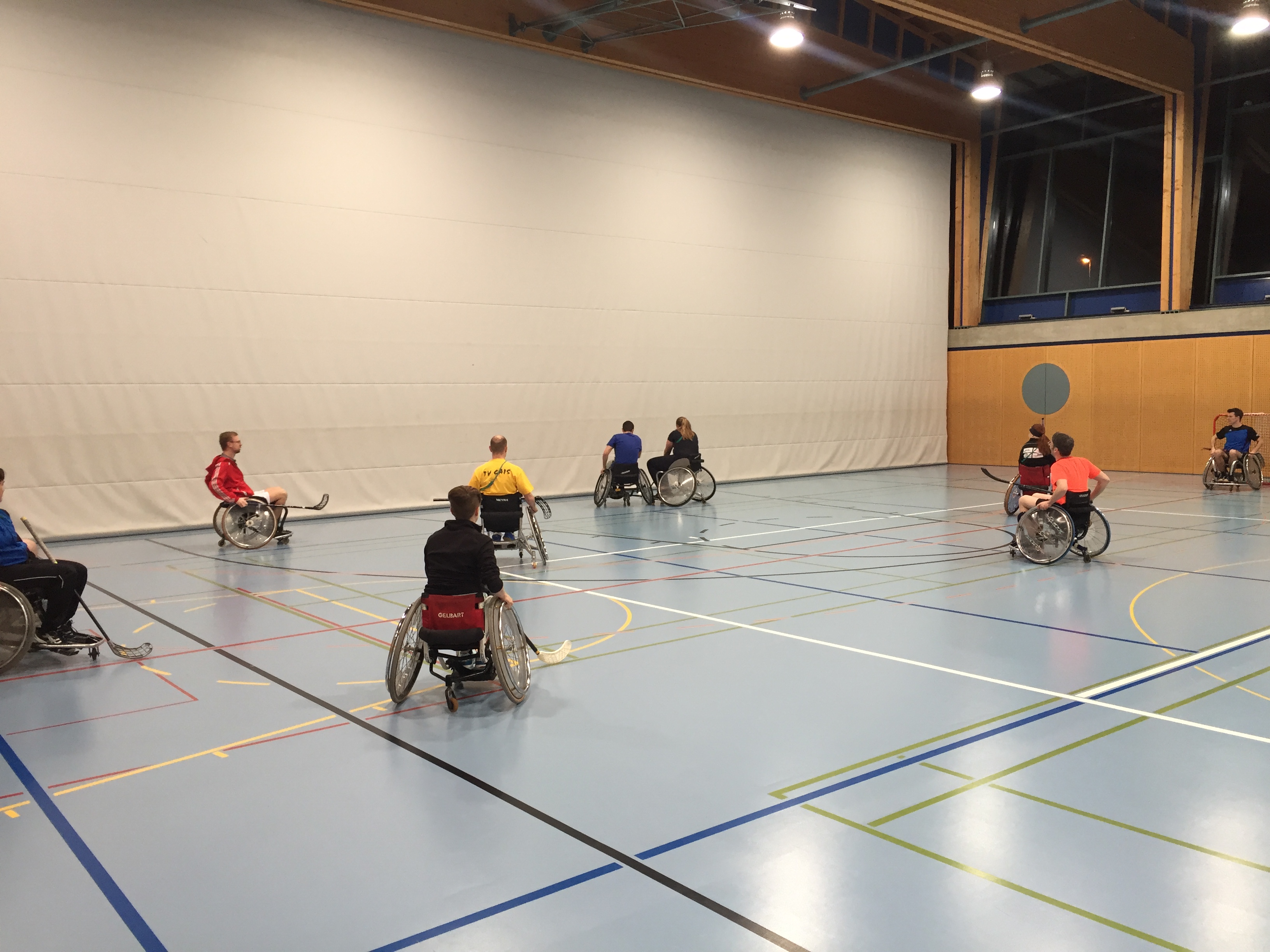 Anschliessend an den Vortrag gingen wir mit dem lokalen Turnverein in die Turnhalle und erlebten was es bedeutet im Rollstuhl zu sein, welche hindernisse eine Bordsteinkante sein kann, wie man Treppen hinauf kommt usw. Zudem durften wir erleben wie man im Rollstuhl Sport macht (Rollstuhlunihockey und Rollstuhlbasketball wurden aktiv aussprobiert).