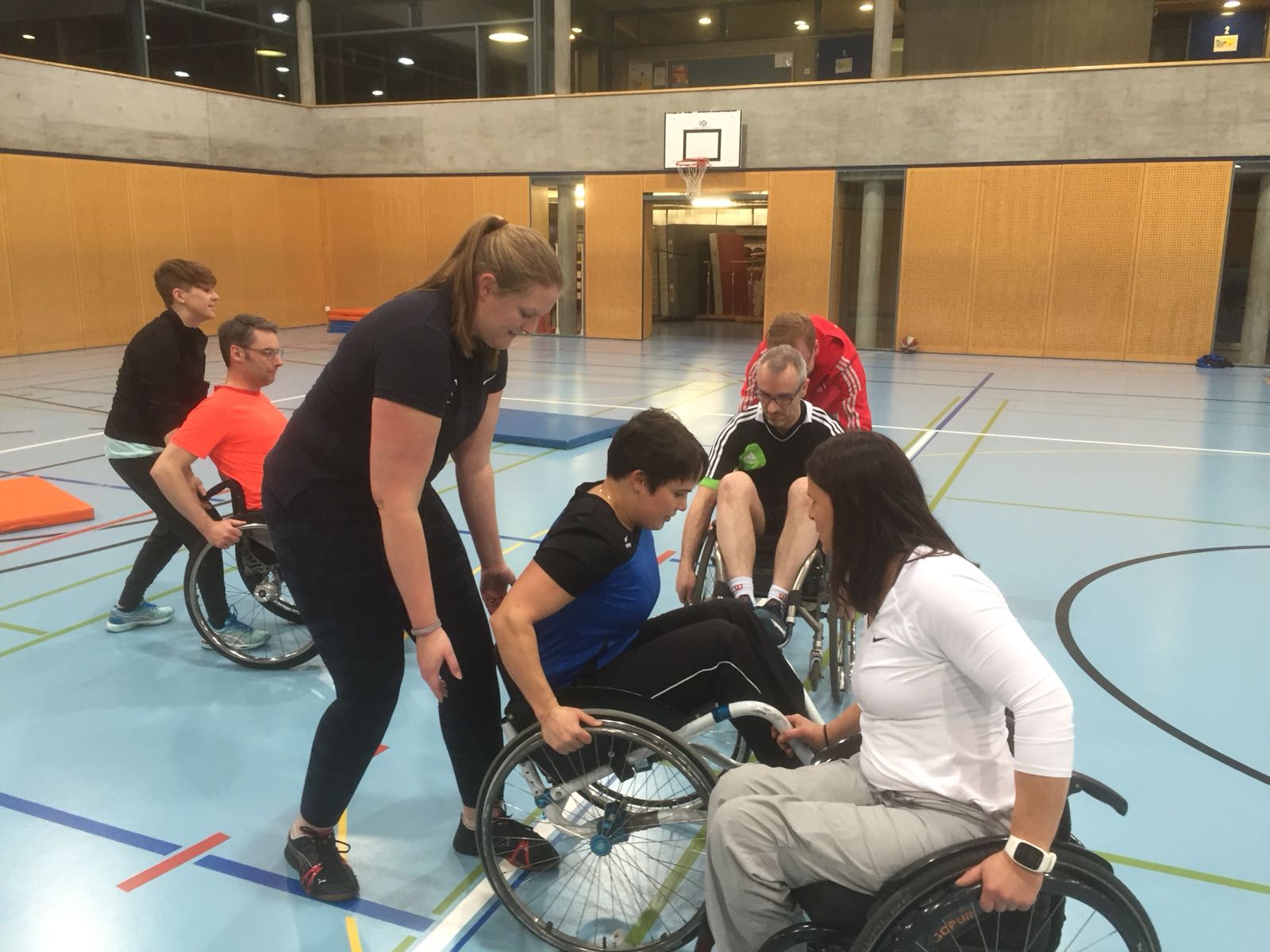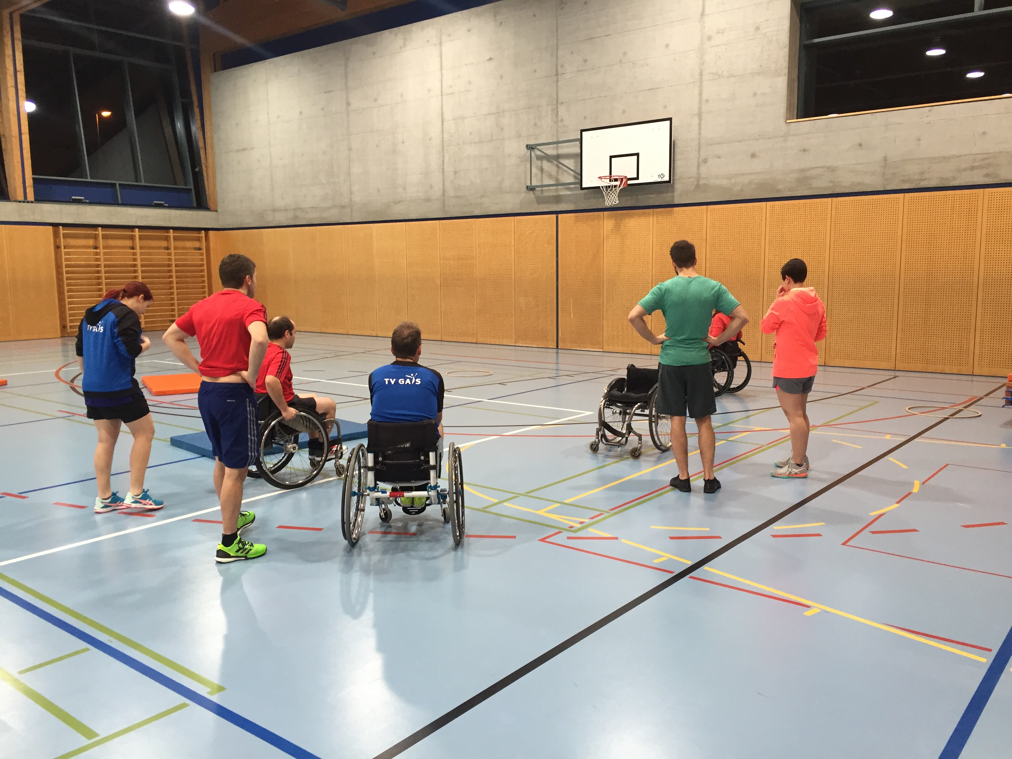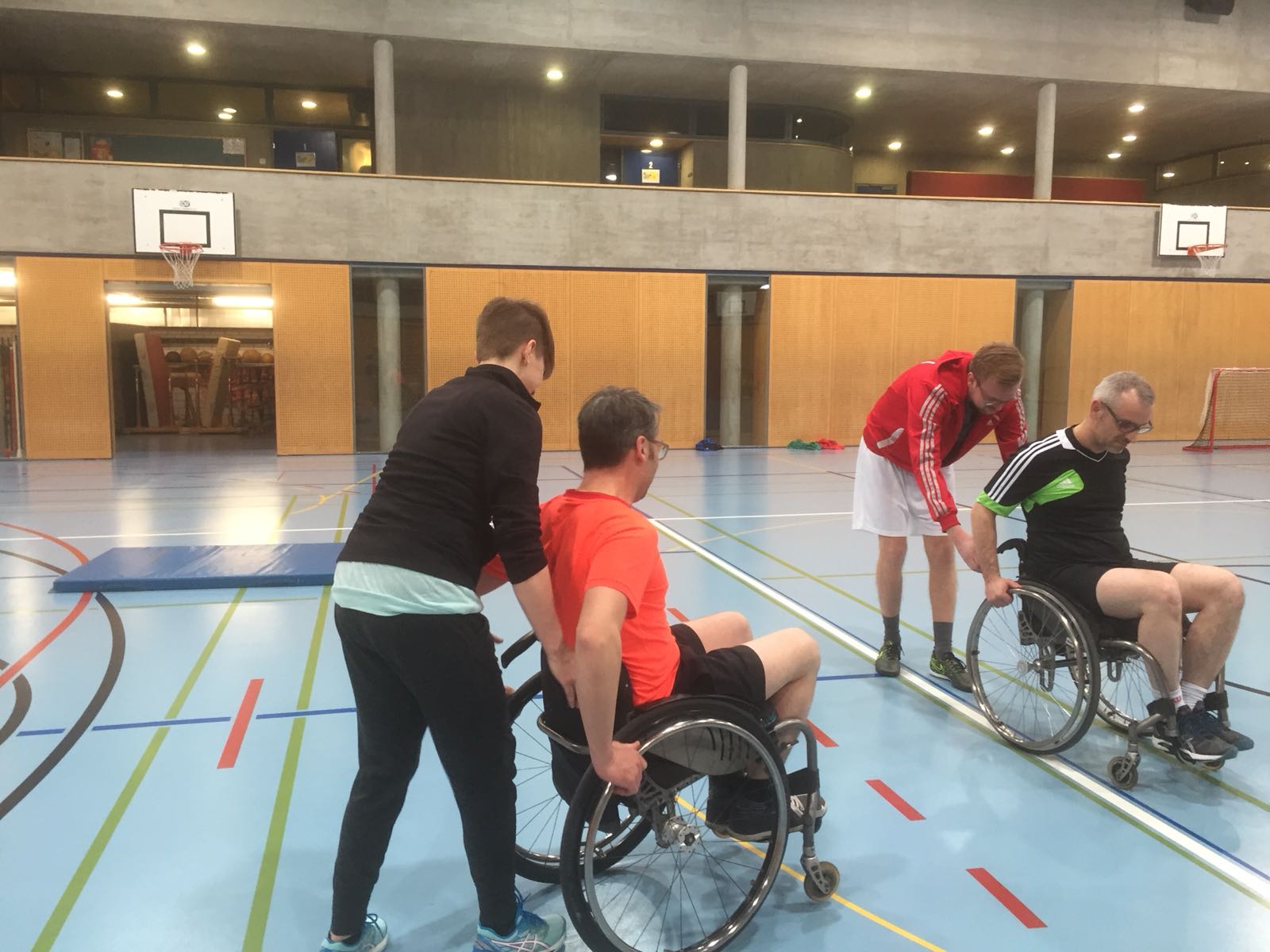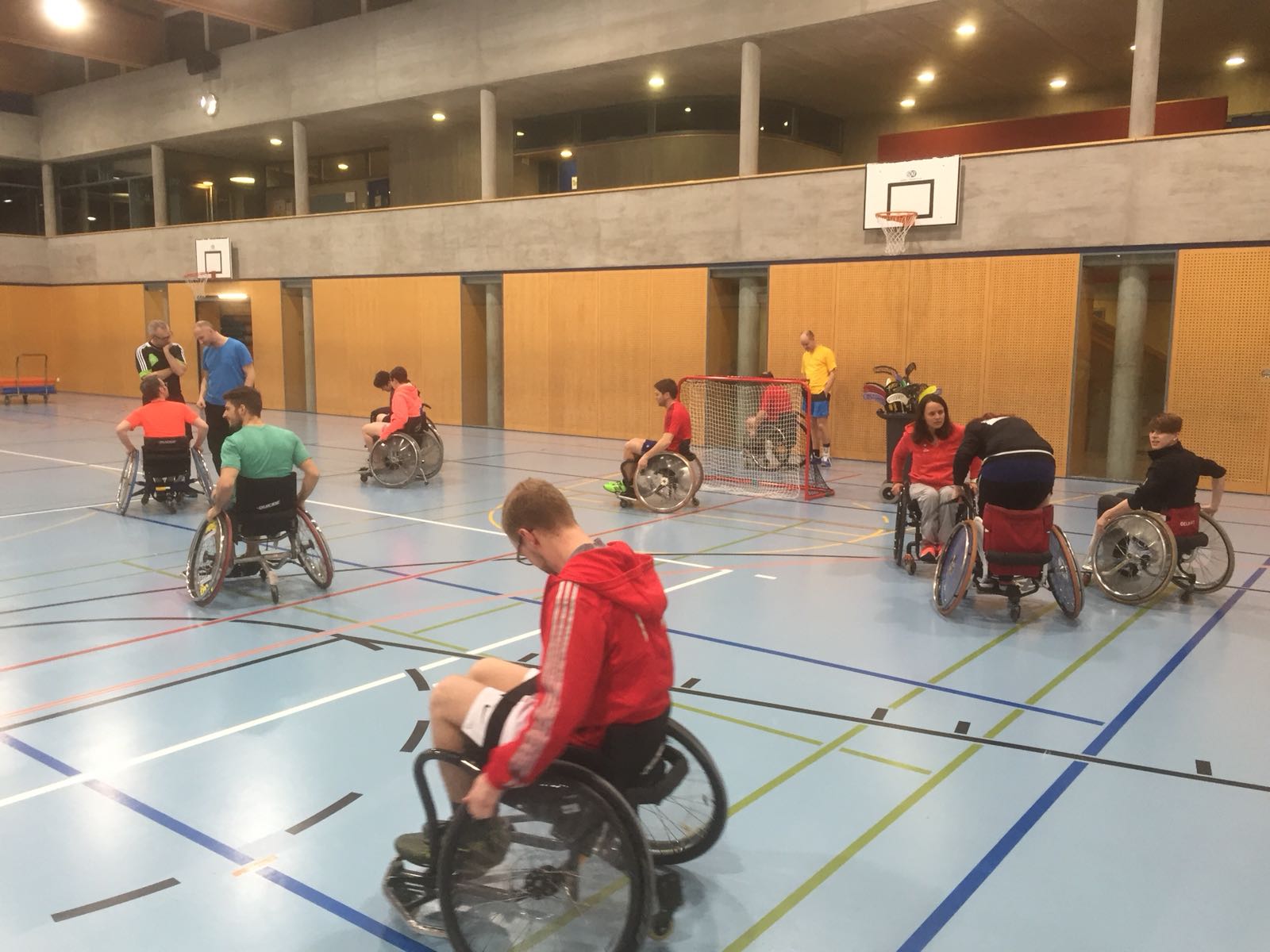 Anschliessend an den Vortrag gingen wir mit dem lokalen Turnverein in die Turnhalle und erlebten was es bedeutet im Rollstuhl zu sein, welche hindernisse eine Bordsteinkante sein kann, wie man Treppen hinauf kommt usw. Zudem durften wir erleben wie man im Rollstuhl Sport macht (Rollstuhlunihockey und Rollstuhlbasketball wurden aktiv aussprobiert).