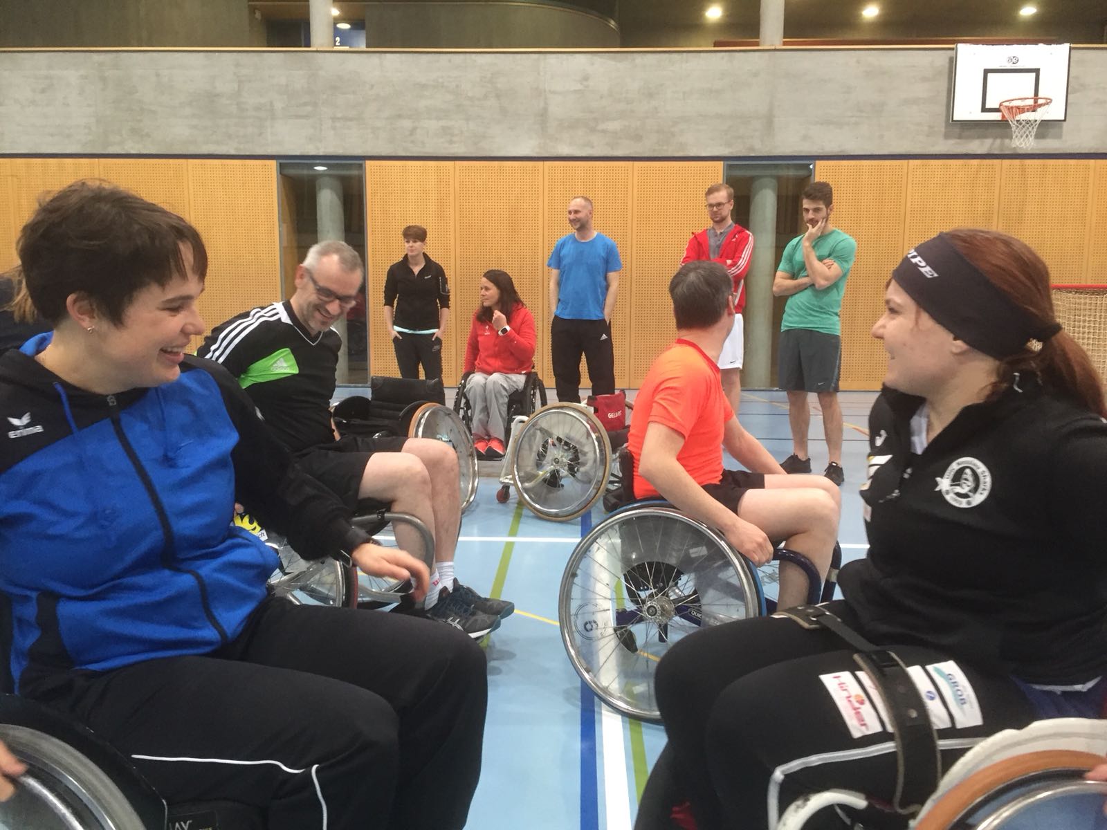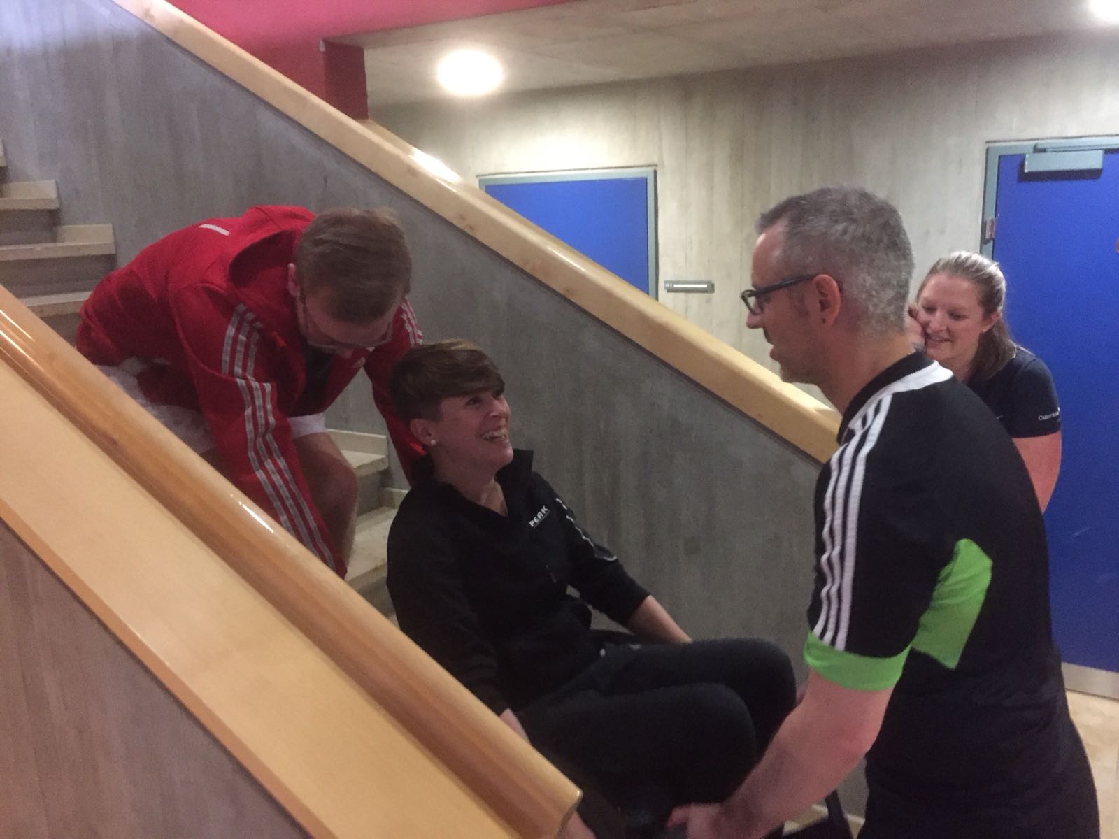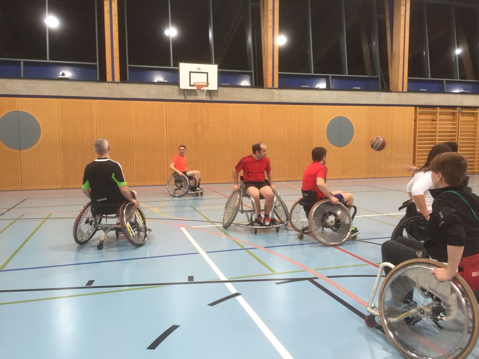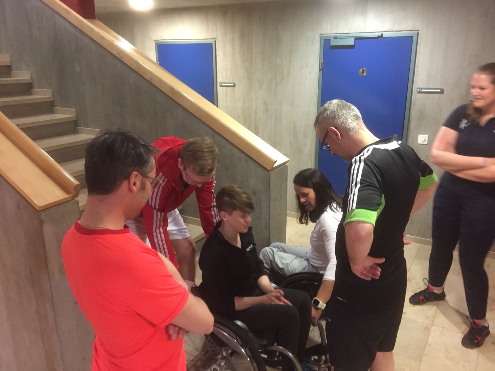 Anschliessend an den Vortrag gingen wir mit dem lokalen Turnverein in die Turnhalle und erlebten was es bedeutet im Rollstuhl zu sein, welche hindernisse eine Bordsteinkante sein kann, wie man Treppen hinauf kommt usw. Zudem durften wir erleben wie man im Rollstuhl Sport macht (Rollstuhlunihockey und Rollstuhlbasketball wurden aktiv aussprobiert).