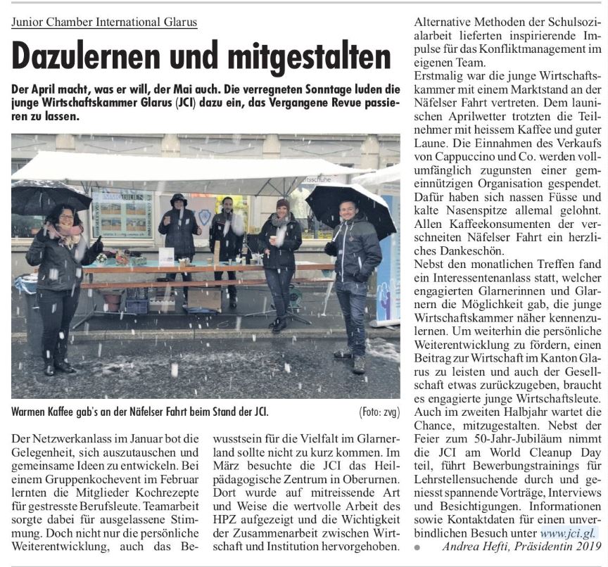 Die Näfelser Fahrt ist ein kantonaler Feiertag und lädt die Glarner Bevölkerung jährlich zu regem Treiben mit Marktbetrieb ein. Dies haben sich die Mitglieder der JCI Glarus zum Anlass genommen, um mit einem Marktstand auf die ehrenamtliche Organisation ReDog aufmerksam machen. Mit dem Verkauf von Kaffee, Capucchino und co. sollten Spenden gesammelt werden. Dieser Charity Marktstand stand ganz im Zeichen des Jahresmottos 2019: We act, we care, we coach.