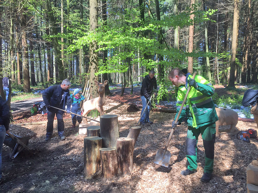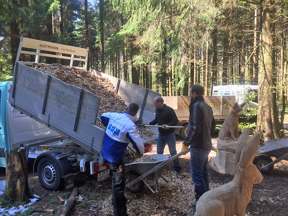 Die Baumstämme, die den Weg umschliessen, und alle Holzschnitzel darin wurden bereits mehrmals ersetzt. Zudem stellten die Helfer mit Baumstämmen Hindernisse wie eine kleine Brücke oder in den Boden geschlagene Holzpfosten auf. So könnten die Kinder ihr Gleichgewicht unter Beweis stellen. Figuren aus Holz wurden geschnitzt und zieren nun einen neuen Posten. Das Projekt lief während 20 Jahren und wurde dieses Jahr zum vorerst letzten Mal durchgeführt.