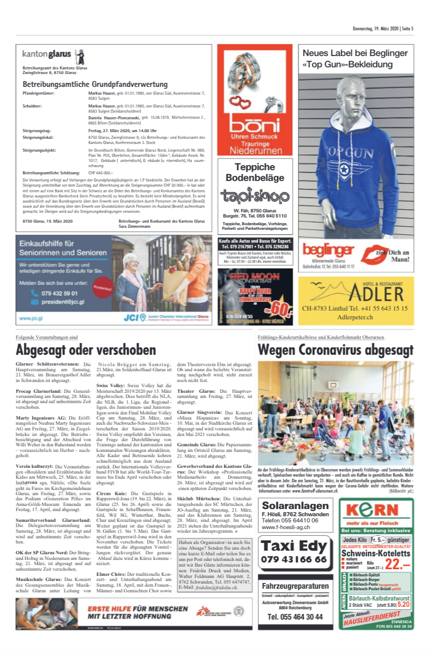 Dans le canton de Glaris, huit membres de la JCI, et d'autres bénévoles extérieurs au projet, ont travaillé chaque jour pour faire les courses pour des groupes à risque et notamment des personnes âgées. Ces dernières pouvaient s'inscrire via leur numéro de portable ou leur adresse électronique, après quoi un membre du groupe faisait les courses en question et les apportait directement chez la personne âgée (il va de soi que tout était gratuit). Tous les membres de la JCI ont fait montre d'un plein engagement et nous, à la JCI, d'une puissance en main-d'œuvre masculine et surtout féminine ! Les « clients » nous donnaient la liste de leurs courses soit directement par téléphone, soit par Whatsapp ou par courrier électronique.