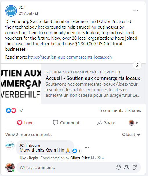Grâce à la force et l'engagement de la JCIS et ses OLM participantes au projet, nous avons pu récolter CHF 2'418'917.- pour plus de 4'500 commerçants dans toute la Suisse. Un magnifique élan de solidarité de la population Suisse envers ses commerçants locaux et une très belle vitrine pour la Jeune Chambre Internationale.