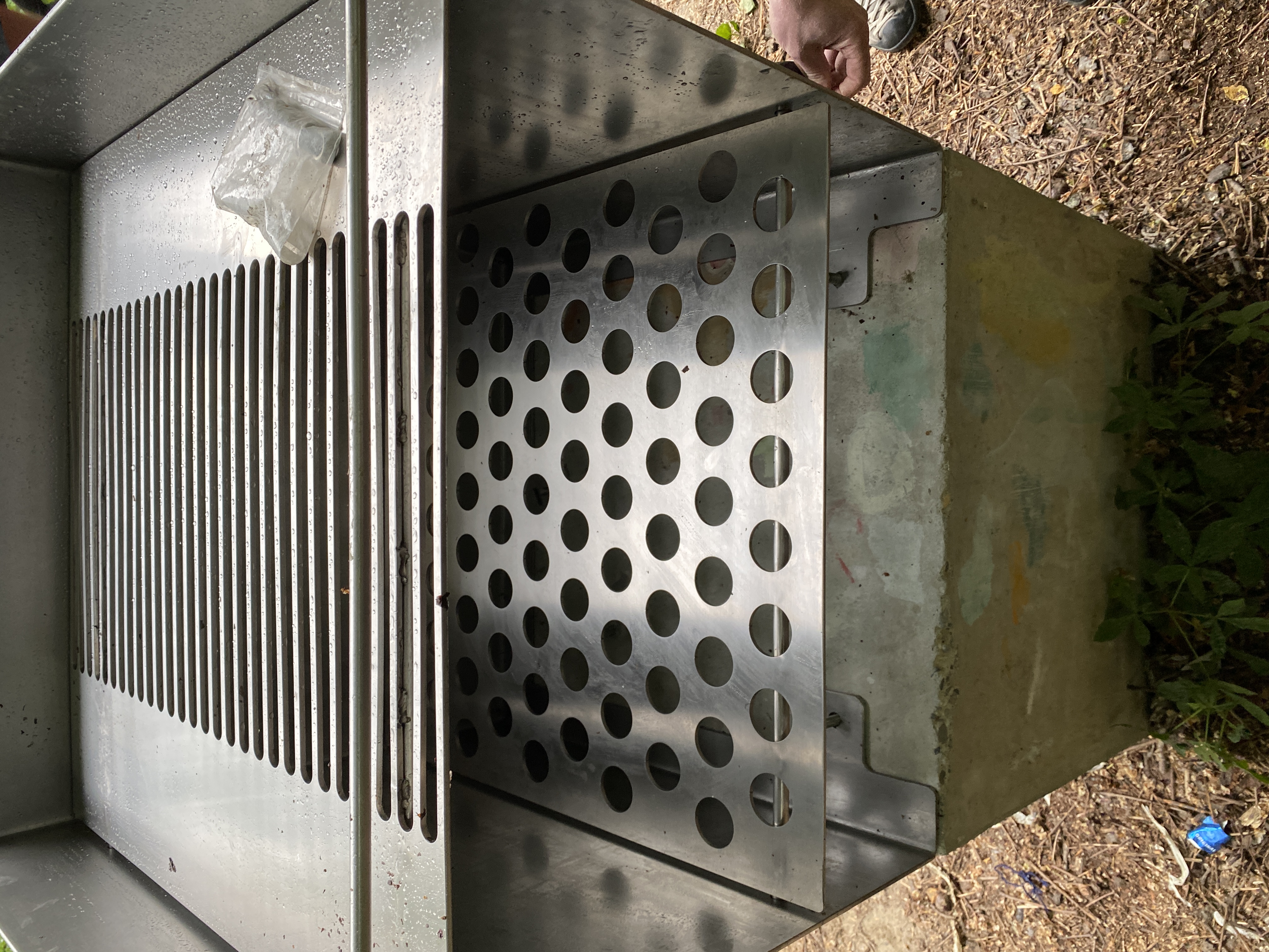 Construction : socle en béton de 60cm sur 60cm, gril entièrement sur mesure, avec une tôle en inox pliée d'une seule et unique pièce pour la partie extérieure.